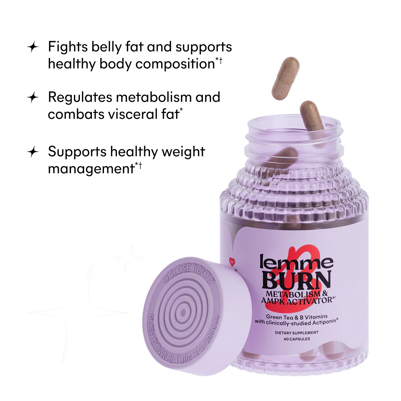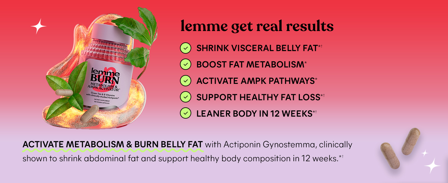 Lemme Burn is formulated with clinically-studied Actiponin®Gynostemma Extract, shown to target abdominal fat, regulate metabolism and support healthy body composition, in combination with healthy diet and exercise (based on a 12-week study).*