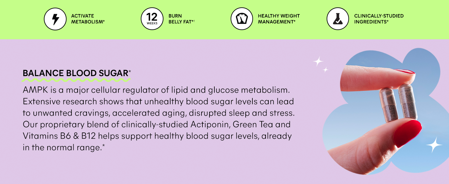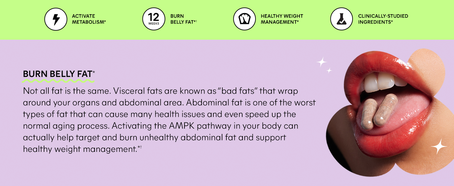 Two capsules a day, with or without food, to trigger AMPK levels, support your metabolism, fight body fat (especially unhealthy abdominal fat) and support healthy weight management.*†
