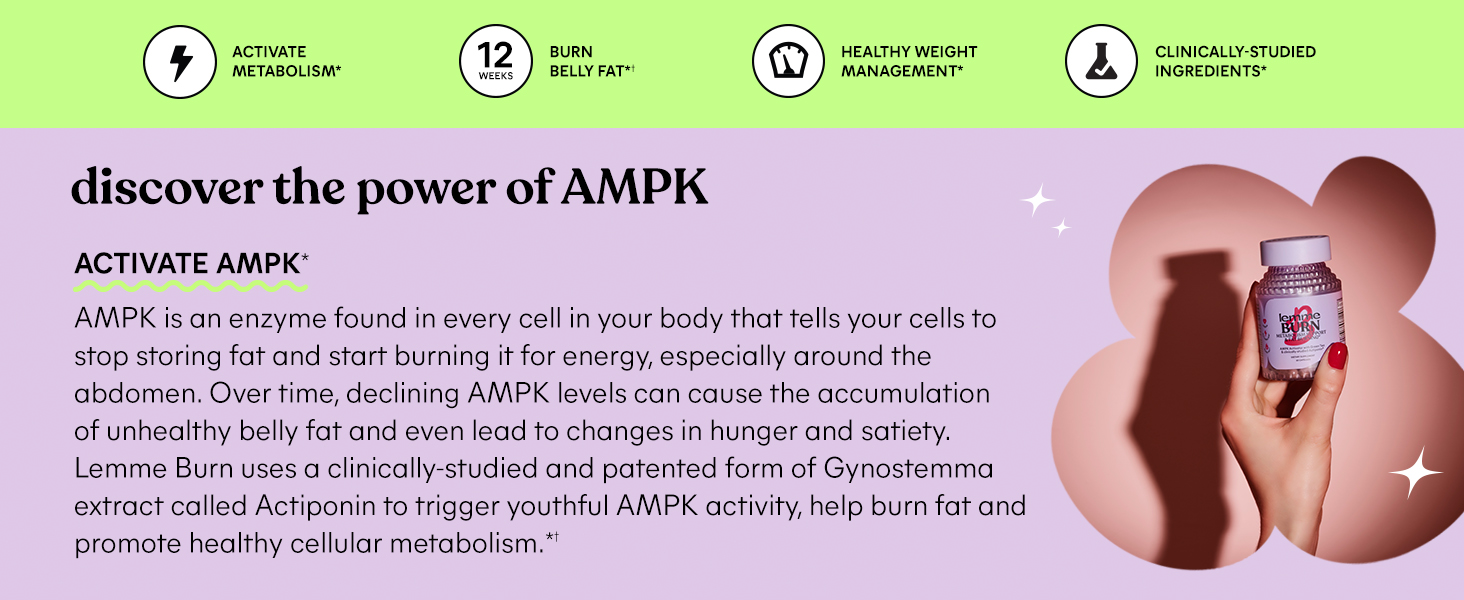 AMPK is an enzyme found in every cell in your body that tells your cells to stop storing fat and start burning it for energy, especially around the abdomen. Lemme Burn uses a clinically-studied and patented form of Gynostemma extract called Actiponin® to trigger AMPK activity, help fight body fat and promote healthy cellular metabolism.*†